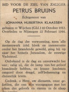 Piet Bruijns was de zoon van Mathea Bruijns vader onbekend. Piet was getrouwd met Johanna Hubertina Klaassen en hij werkte bij kapperzaak De ...