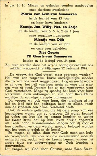 Bronnen: (Frank Eliëns), Geraakt in het hart, Nijmegen 22 februari 1944 (Nijmegen 2000; Bart Janssen, De pijn die blijft (Nijmegen 2005); Joost Rosendaal, Nijmegen '44 (Nijmegen 2009); bidprentje voor alle slachtoffers op www.noviomagus.nl B 109 en op dezelfde site de namen van de slachtoffers en ca. 270 bidprentjes van slachtoffers; e-mail H.J. Hendriks 6.4.09 met foto van monument en massagraf-heuvel Graafseweg. Zie ook de documentaire van Ruud den Brok uit 2005 op YouTube. Op 22 februari 2020 onthulde wethouder Vergunst een overzichtsbord van de graven op de Begraafplaats Daalseweg.