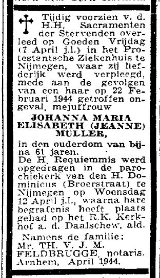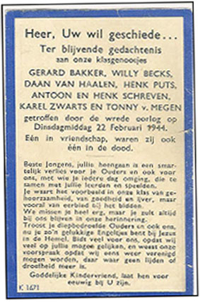 Zie Jos Beke, De Josephscholen 1877-2002, Nijmegen 2002, p. 108; collectie Bart Janssen met foto van klas van de St.-Josephschool, waarin 8 slachtoffers zaten; bidprentje van de acht scholieren op www.noviomagus.nl B089; e-mail Bob Berkvens 14 maart 2011 met bidprentjes en klassefoto
