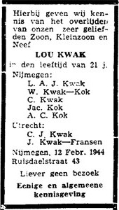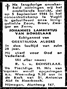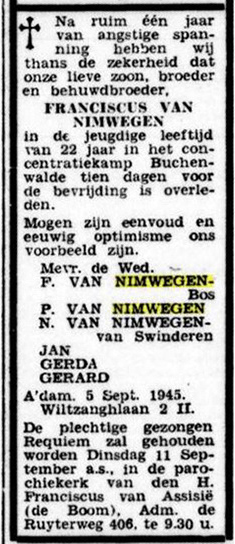 Wegens den arglistigen moord en moordaanslag op leden der bezettende macht op 6 en 7 juli 1944 te Nijmegen is een aantal gearresteerde terroristen en saboteurs standrechtelijk doodgeschoten. (w.g.) Rauter, SS-Obergruppenführer und General der Polizei.’