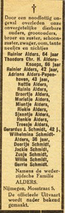 Het gezin Alders-Papenhoven schuilde samen met het gezin Schmidt-Alders en de grootouders Alders-Knoops in de kelders van de kapokfabriek. De kelders waren echter niet zo veilig als zij dachten en bleken niet bestand tegen bominslagen. Netty komt samen met haar ouders en acht broers en zusters bij deze bominslag om het leven.