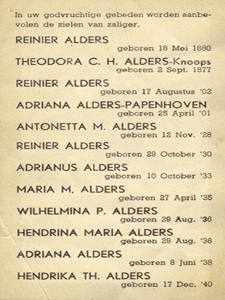 Reinier is een zoon van Reinier Alders (geboren 1902) en van Adriana van Papenhoven. Negen van de tien kinderen van dit gezin kwamen samen met de ouders en grootouders om bij de bominslag op de kapokfabriek. Dit gezin schuilde in de kelders van de kapokfabriek samen met de grootouders Alders-Knoops en het gezin Schmidt-Alders in de veronderstelling dat die kelders veilig waren en bominslagen konden weerstaan. Helaas bleek dat laatste niet het geval.
