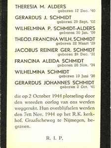 Het echtpaar Alders-Papenhoven schuilde met alle negen kinderen, waaronder Mientje, in de kelders van de Kapokfabriek in de Ruyterstraat. Zo ook de grootouders, het echtpaar Alders-Knoops en het gezin Schmidt-Alders. Allen kwamen om door een bominslag.