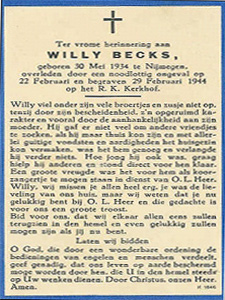 Willy Becks, zoon van Antonius F. Becks en Elisabeth J.Hocksenar, is getroffen bij de tramhalte op het Valkhofplein. Hier zijn op 22 febr. '44  8 kinderen omgekomen: Gerard Bakker, Willy Becks, Daan van Haalen, Tonny van Megen, Henk Puts, Antoon en Henk Schreven en Karel Zwarts, allen kinderen van de St.-Josephschool in de Koolemans Beynenstraat.