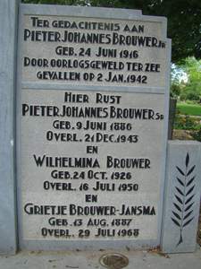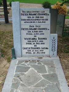 De 57-jarige Pieter Johannes Brouwer  maakte deel uit van een  onderduikgroep en werd gearresteerd op 29 april 1943. Op 21 december 1943 is hij in Nijmegen overleden na ziek te zijn geworden in de gevangenis van Scheveningen. Hij liet een weduwe en zeven kinderen achter. Een zoon, Pieter Johannes jr., is in januari 1942 omgekomen door Japanse beschieting in de Javazee.