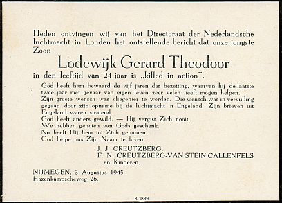 Bronnen: OGS + foto gedenksteen Ereveld Mill Hill in Londen. Naar J.J. Creutzberg en Cavaljé zijn straten genoemd in Nijmegen; Jaarboek Numaga 2013, p.46-47 over het gezin van J.J. Creutzberg; PK; Wolter Noordman, Luchtalarm op de Veluwe (Kampen 2002), p. 22-23. Adriaan van Boven, 'LO-Overijssel', Het Grote Gebod. Gedenkboek LO-LKP, 'In memoriam L.G.F. Creutzberg', De Zwerver van 24 augustus 1945. Henk van der Duim, Wij herdenken ... (Erven Tijl, Zwolle, tweede druk 1946). Het archief van Loed Creutzberg, met o.a. brieven aan zijn ouders in Nijmegen van mei-juli 1945, bevindt zich in het Regionaal Archief Nijmegen (overgedragen door J.J. van Leeuwen te Zutphen).