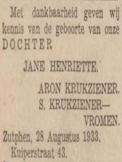 Jane was de dochter van Aron Cutzien (zich noemende Krukziener) en Sara Vromen. Jane werd 8 juni 1943 met het "kindertransport" uit Kamp Vught via Westerbork op transport gesteld naar Sobibor om er direct vermoord te worden. In 1949 werd zij als oorlogsvermiste officieel gestorven verklaard en in Nijmegen - volgens de OGS haar laatst bekende adres - werd in 1950 de overlijdensakte opgetekend. Haar ouders hebben de oorlog overleefd, aldus www.Joodsmonument.nl .