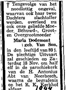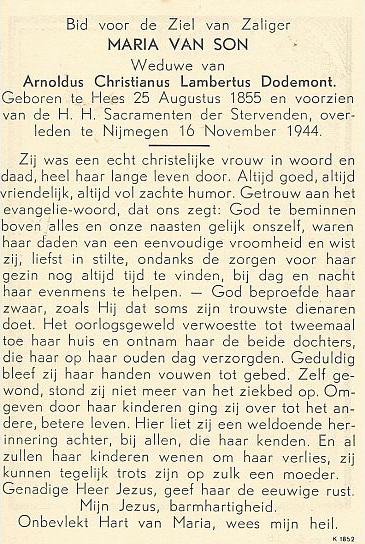 Maria Dodemont-Van Son was 89 jaar toen op 25 september 1944 een Britse B-25 Mitchell-bommenwerper op haar woning aan de Dorpsstraat 148 te Hees (Nijmegen) neerstortte. Haar beide dochters, Dina en Nolda, kwamen daarbij direct om. De hoogbejaarde moeder Dodemont werd nog levend onder het puin vandaan gehaald, maar liep hierbij een longontsteking op. Daaraan overleed zij op 16 november 1944. Haar stoffelijke resten werden op 18 november 1944 begraven op het kerkhof van de parochie Antonius Abt te Neerbosch.
