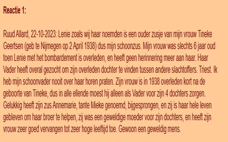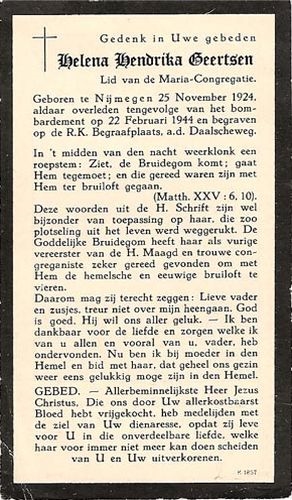 Leny Geertsen , dochter van Wilhelmus H.Geertsen  en Anna M.H.Janssen, was winkelmeisje bij Leenders Kantoorboekhandel op het Kelfkensbos. Onderweg naar haar werk is Helena omgekomen.