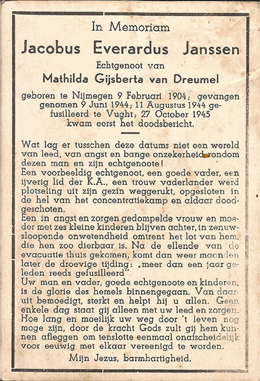 Jacques Janssen werd in 1904 in Nijmegen geboren en trouwde in 1928 in Nijmegen met Mathilda Gijsberta van Dreumel. Ze krijgen 6 kinderen en wonen in de oorlog in Roermond. Hij is een neef van de Franciscaan , pater Sebald(= Jan Linders), zijn vertrouwensman en contactpersoon met het verzet in Nijmegen. Samen verrichten ze verzetswerk, o.a.bonkaarten verwerven voor onderduikers, geallieerde piloten begeleiden naar België. Na verraad door de infiltrant-verzetsman Joop de Heus (*Utrecht 3 juli 1918) wordt hij op 9 juni '44 met anderen opgepakt door de Sicherheitspolizei. Samen met pater Sebald wordt hij op 11 augustus 1944 in of nabij Kamp Vught gefusilleerd. Pas op "27 oktober  van 1945 kwam eerst het doodsbericht", aldus het bidprentje.