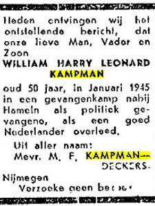 Bronnen: PK ; www.erelijst.nl ; collectie Bart Janssen met foto ; OGS met foto grafmonument ; na echtscheiding was hij hertrouwd met M.F.Deckers. In de Gelderlander van 23 mei 1945 is door de weduwe  M.F. Kampman-Deckers een overlijdensbericht geplaatst:  als politiek gevangene en als goed Nederlander zou William Kampman zijn omgekomen in een gevangenenkamp nabij Hameln; e-mail Rob Essers 4 augustus 2011 met personalia, Sterbeurkunde (Holzen 31 okt.'45) en overlijdensannonce uit De Gelderlander. Eerste huwelijk 2 kinderen, tweede 1 kind + stiefzoon.; www.euprojekt-zuchthaus-hameln.de ; Bart Janssen, Het verdriet van Nijmegen 1940-1945 blz 667 ev  PK