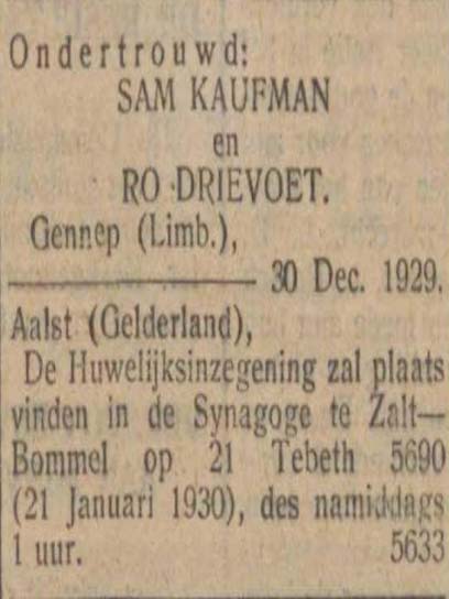 Op 30 december 1929 gingen Roosje Drievoet en Samuel Kaufman in ondertrouw. Samuel kwam uit Gennep en Roosje uit Aalst (Gld). Zij trouwden op 21 januari 1930 in de Synagoge te Zaltbommel. Roosje en Samuel vestigden zich op 16-05-1934 in Nijmegen, komende vanuit Gennep.