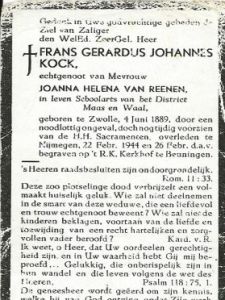 Frans Kock, zoon van Gerhardus J. Kock en Maria M.J. Bentla, woonde met zijn echtgenote Johanna H. van Reenen en vier kinderen in Beuningen waar hij ook huisarts was. Op de 22e febr. '44 reed Frans Cock naar Nijmegen om zijn zoon naar school te brengen en zijn vrouw in de Hertogstraat af te zetten. Hans en zijn moeder stapten uit en Frans reed door naar het Kelfkensbos waar hij door de bommen zwaar gewond raakte. Kort daarop is hij bij de zusters van Hallo in de Lindenberg overleden. Zijn naam staat vermeld op de herdenkingsplaquette op de kerkmuur in Beuningen.