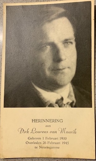 Dirk van Mourik werd op 31 januari 1900 in Tiel geboren. Hij was daar koopman in boeken en fruit en tevens clandestien depothouder van wapens voor het verzet in Tiel. Hij was ondergedoken in Nijmegen in de Beijenssteaat nr 80. Zijn onderduikadres is door een onbekende persoon verraden en hij werd  gearresteerd op 6 mei 1944. Tussen 6 mei 1944 en 11 oktober 1944 zat Dirk gevangen in Kamp Amersfoort. Op 26 februari 1945 is hij omgekomen in KZ Neuengamme.