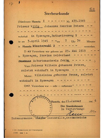 Willy, zoon van Johannes W. Peters en Berdina W.P.Veldhoven (†1925), werd in het kader van de Arbeitseinsatz als kapper in Duitsland te werk gesteld. Hij was verloofd met Miep Bökkerink (*9-5-1920 -- 11-7-2008) uit Nijmegen. De verloving vond plaats anderhalve maand na het bombardement van 22 februari 1944. Hij mocht toen terug naar Nijmegen, omdat zijn ouders, het echtpaar Johannes W. en Wilhelmina Peters-Brons - tweede echtgenote van zijn vader  -  met hun vijf kinderen Gerard, Henk, Leo, Josephientje en Rudolf bij dit bombardement waren omgekomen. Uit het eerste huwelijk van vader Johannes waren naast Willy nog drie dochters geboren, Annie, Died en Dolly. Willy zette de kapperszaak van zijn vader voort aan de Graafseweg, tot de Duitsers er door verraad achter kwamen dat hij in de kapperszaak illegale lectuur had laten zien en hij in Nijmegen onderduikers hielp. Hij werd opgepakt en naar de strafgevangenis in Hameln getransporteerd. Lange tijd wist de familie niet waar Willy zich bevond en of hij nog leefde. Geruime tijd later werd pas duidelijk dat Willy zeer vermoedelijk in april 1945 door zware mijnarbeid, uitputtine en ondervoeding om het leven is gekomen.  Zijn Sterbeurkunde (Hameln 21-01-1946) vermeldt: "Todesursache: Stärke Durchfalle, Herzschwäche".  Zijn laatste levensteken was van 4 februari 1945.