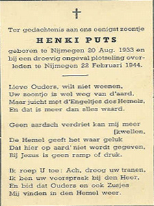 Henkie Puts, zoon van Hendrikus Theodorus Puts sr. en Jakoba W. Brouwer, kreeg les op de school op het Kelfkensbos, omdat de St.-Josephschool door de Duitsers gevorderd was. Op de 22e februari '44 had hij bij uitzondering twee stuivers gekregen voor de tram. Hij verheugde zich erop om met zijn vriendjes op de terugweg tot het eindpunt mee te rijden. Na de tramhalte in de Burchtstraat, waar Henkie in de tram stapte,  werd hij samen met andere scholieren door de bommen getroffen op het Kelfkensbos. Hij overleed ter plaatse. Samen met hem kwamen zijn klasgenootjes G. Bakker, W.Becks, D. van Haalen, T. van Megen, de broers T. en H. Schreven en C.Zwarts om het leven