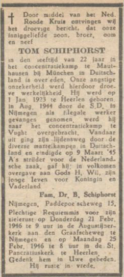 Overlijdensbericht in Limburgs Dagblad van 16-2-1946