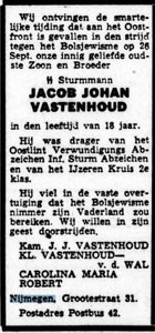 Jaap Vastenhoud was de oudste zoon van de kantoorbediende Johannes Jacobus Vastenhoud(*14-10-1900) en Carolina Maria van der Wal, die op 1 mei 1923 in Hilversum trouwden en zich vestigden in het nabije 's-Graveland. Daar werd op 6 april 1924 zoon Jacob Johan (Jaap) geboren. Wanneer het gezin, waar ook nog dochter Carolina Maria en zoon Robert geboren werden, naar Nijmegen verhuisde is niet bekend. Daar betrok dit NSB-gezin het huis aan de Grotestraat nr.31, waar anderhalve eeuw eerder de joodse moeder Henriëtte Presburg van de joodse grondlegger van het marxisme, Karl Marx, gewoond had. Jaap meldde zich al in juni 1940 als 16-jarige jongen aan bij de Waffen-SS en trok naar het Oostfront, toen Hitler de Sovjet-Unie de oorlog verklaarde. Hij verwierf in 1942 o.a. het Infanterie Sturmabzeichen en het IJzeren Kruis 2e klasse, aldus De Zwarte Soldaat van 19 nov.'42. De auteur in dit blad verklaarde dat de WA in Nijmegen hoopte, "dat deze kameraad die bij zijn vertrek te jong was om WA-lid te mogen zijn, eens behouden moge terugkeren om zijn plaats in onze gelederen in te nemen." In Volk en Vaderland van 11 dec.'42 moest zijn vader, Kameraad J.J.Vastenhoud, echter de rouwadvertentie plaatsen met de mededeling dat zijn oudste zoon al op 26 sept.'42 in de strijd tegen het Bolsjewisme aan het Oostfront gevallen was. Hij voegde er aan toe: "Wij willen in zijn geest doorstrijden".