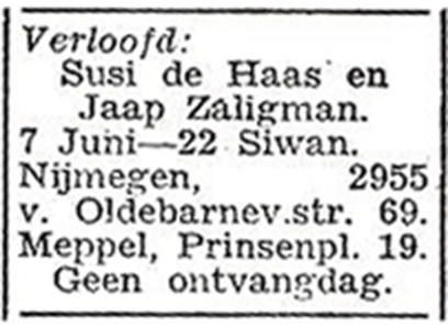 Jacob verloofde zich op 2 juni 1942 met Gezina de Haas, woonachtig in Nijmegen. Zij trouwden kort daarop in Nijmegen op 23 juli 1942. Het jonge stel is maar kort samen geweest. Nog geen maand later werd Jacob opgepakt en naar het werkkamp de Linde in Drenthe gebracht. In augustus werd hij overgebracht naar Westerbork en later naar het Kommando Sosnowice in Polen waar hij op 1 november 1943 overleed.